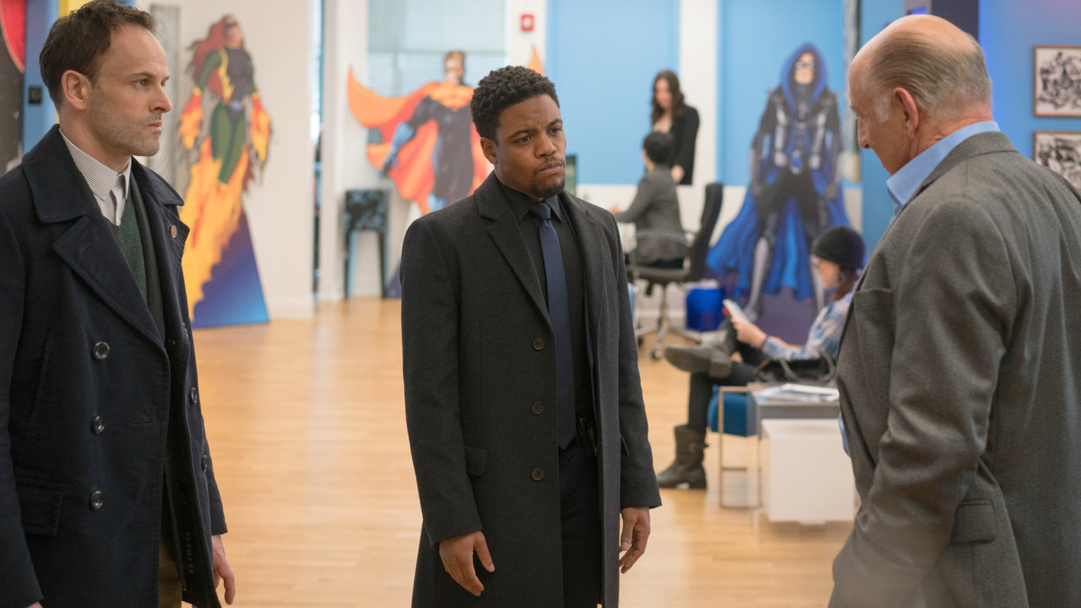 Du hast mich, wer hat dich?Holmes (Jonny Lee Miller, l.) und Detective Bell (Jon Michael Hill, M.) befragen Eddie Eichhorn (Richard Portnow, r.), Chef eines Comicverlags, zum Mord an einem Mann, der sich regelmäßig als Comicheld verkleidete. Kennt Eichhorn möglicherweise dessen wahre Identität?Bild: © Puls 4