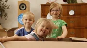 Annelie, Isabel und Emanuel mit ihrem PappkartonBild: © KiKA