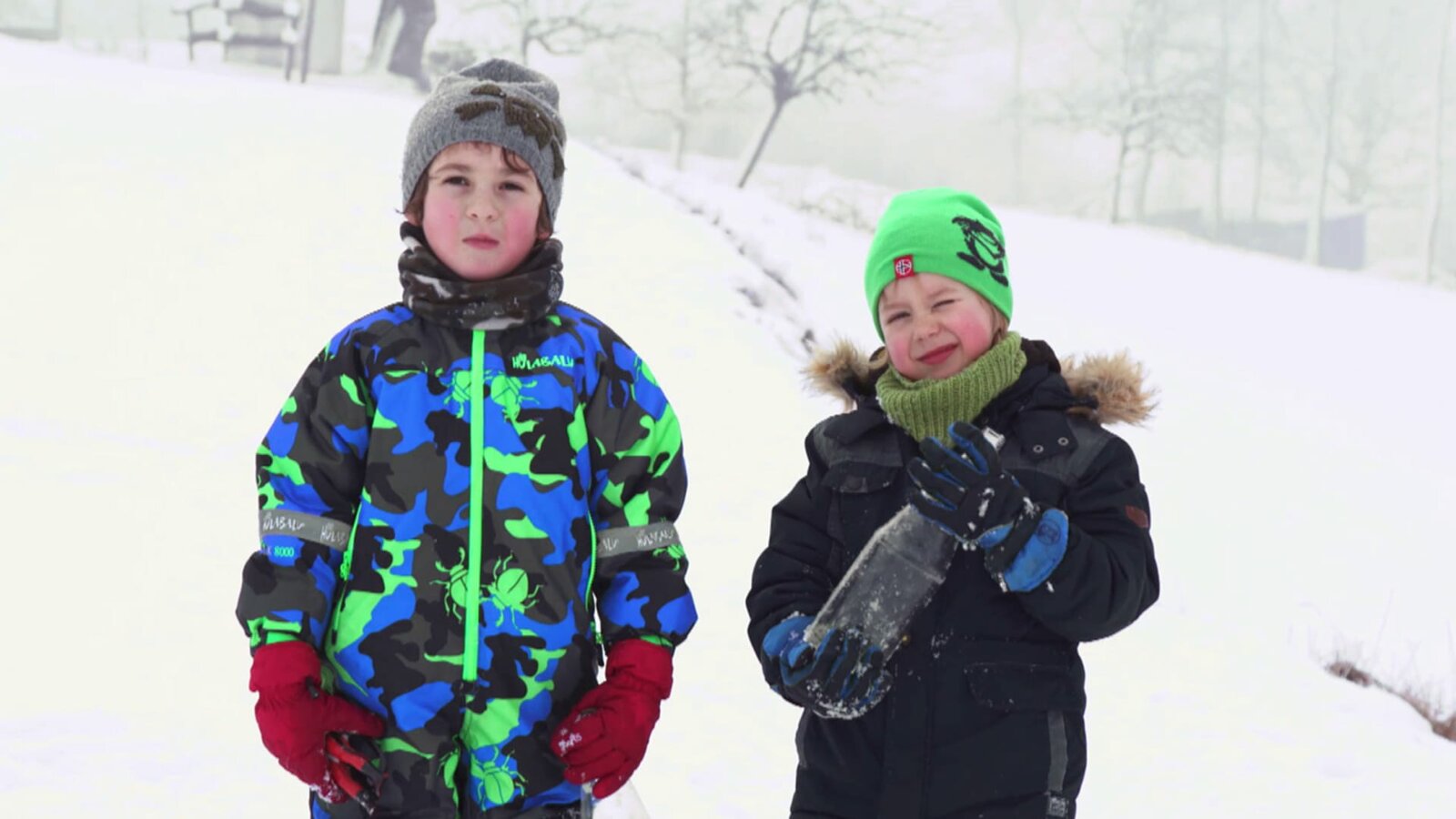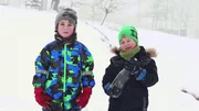 Josef und Elias mit ihrer Bobbahn im Schnee.Bild: © KiKA