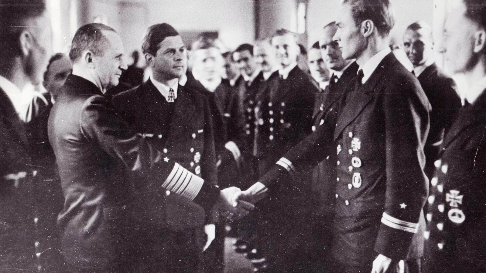 Vom Jäger zum GejagtenIm Jahr 1942 knackte der britische Geheimdienst nach und nach die deutsche Verschlüsselungsmaschine "Enigma". Zusätzlich entwickelten die Alliierten hochauflösende Radar- und verfeinerte Sonargeräte. Die Jäger wurden zu Gejagten. (Foto: Großadmiral Karl Dönitz (l.) inspiziert eine U-Boot-Besatzung, 1944)Bild: © TVNOW