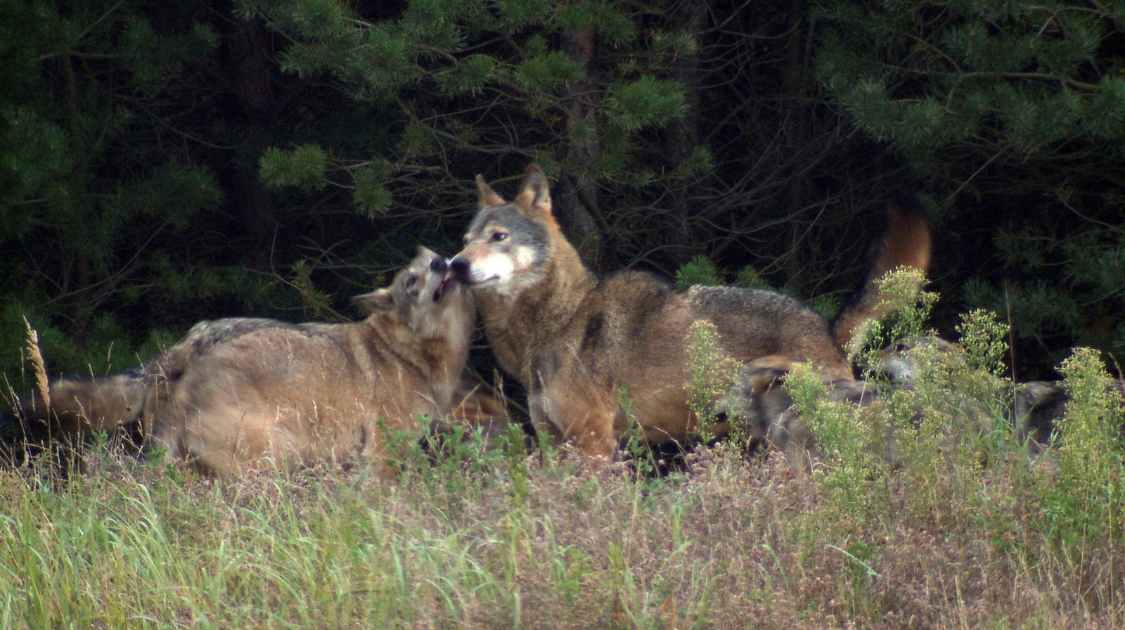 Ein junger Wolf zeigt seinen Respekt vor dem Familienoberhaupt, einem Rüden.Bild: © BR/WDR