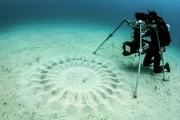 Überleben: Einen Partner findenKameramann Hugh Miller bereitet sich auf einen extrem schwierigen Unterwasserdreh vor: Er will dokumentieren, wie Kugelfische kunstvolle Muster im Sand formen, um Weibchen zu locken. Ein Großteil der Ausrüstung wurde speziell für diesen Dreh angefertigt.Bild: © NDR/BBC/Kat Brown