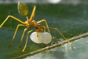 Überleben: Eine Zuflucht findenARD/NDR ERLEBNIS ERDE - ÜBERLEBEN (3), "Eine Zuflucht finden", am Sonntag (14.06.15) um 16:30 Uhr im ERSTEN. Mit Hilfe einer Larve klebt eine ausgewachsene Weberameise zwei Blätter zusammen. Nur die Larven können die klebrige Seide produzieren.Bild: © NDR/BBC/Emma Napper