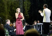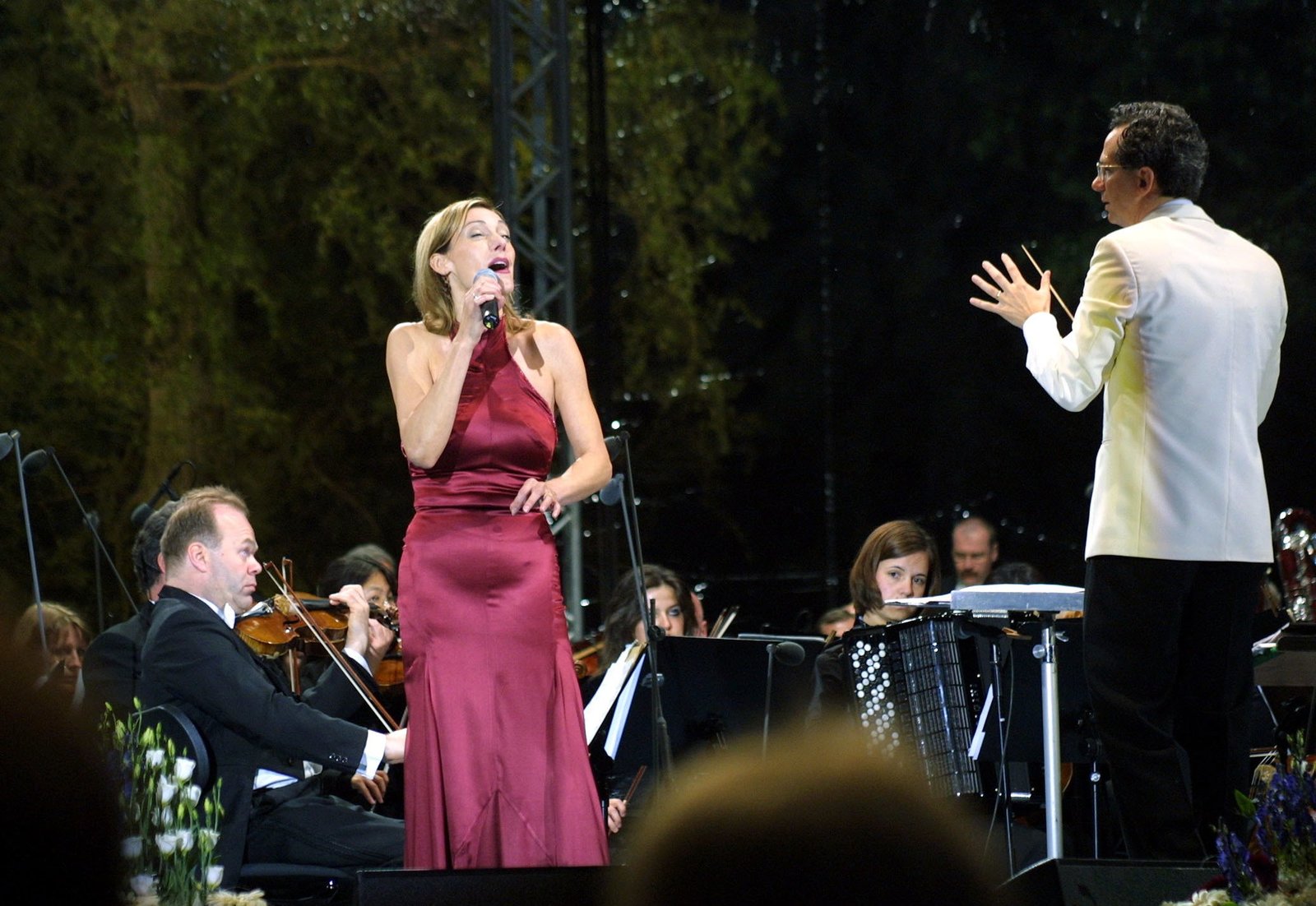 Auf dem Programm des Eröffnungskonzert des MDR-Musiksommers 2004 standen unsterbliche Musical-Melodien, Chansons und Orchesterwerke, darunter Ausschnitte aus „Happy End“ und „Aufstieg und Untergang der Stadt Mahagony“ von Kurt Weill sowie „Ein Amerikaner in Paris“ von George Gershwin. Stargast des Abends war Ute Lemper. (Eröffnungsveranstaltung am 26.06.2004 im Kurpark Bad Elster. Ute Lemper mit dem MDR SINFONIEORCHESTER unter Leitung des damaligen MDR Chefdirigenten Fabio Luisi.)Bild: © MDR/Gerhard Hopf