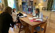 Dreharbeiten bei der Gottesdienst-Vorbereitung im Wohnzimmer von Susanne Regelsberger, mit Dorothea Gimpl (li) und Kamerafrau Gabriele Hanke.Bild: © ORF/Landesstudio Salzburg