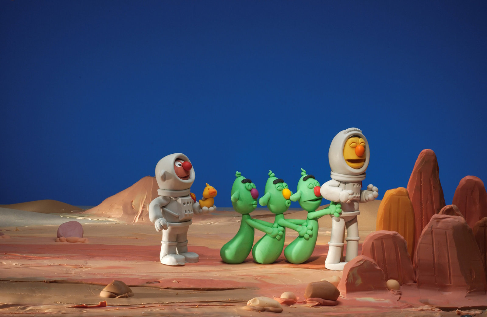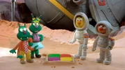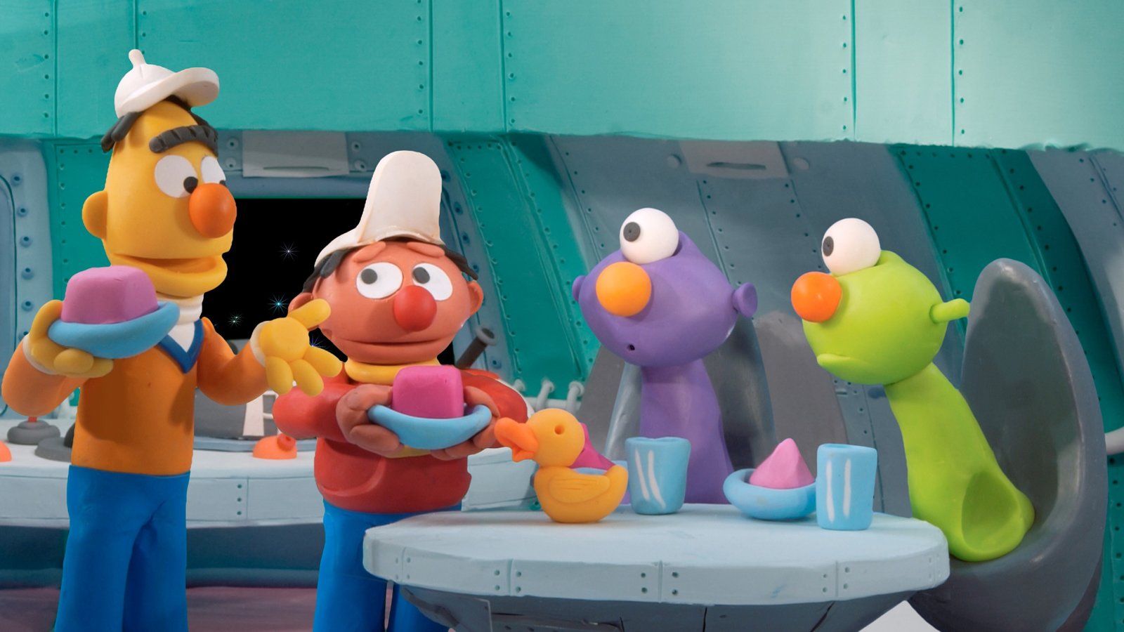 Die AußerirdischenDie Außerirdischen, die auf die Erde kommen, sind ganz begeistert von Quietscheentchen und nehmen es mit an Bord.Bild: © NDR/Sesameworkshop