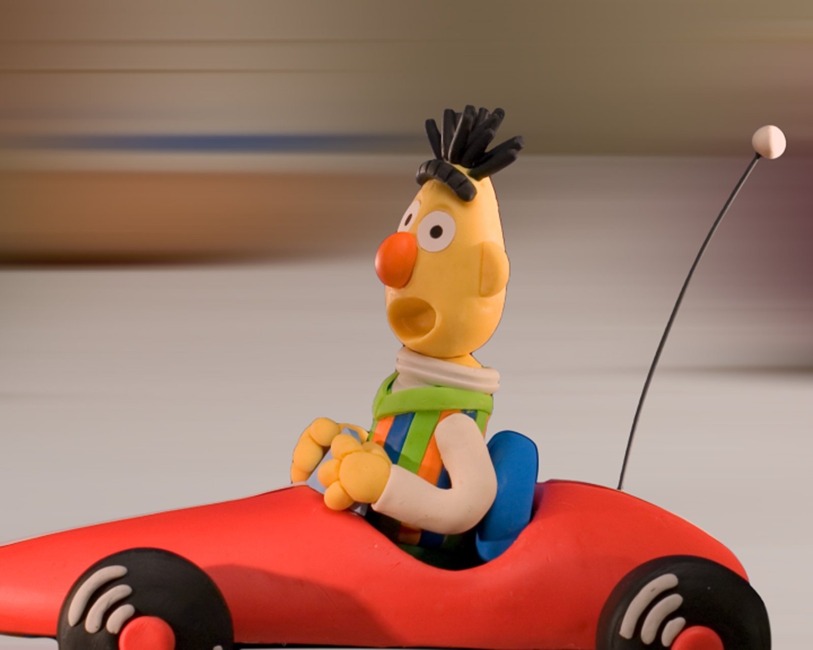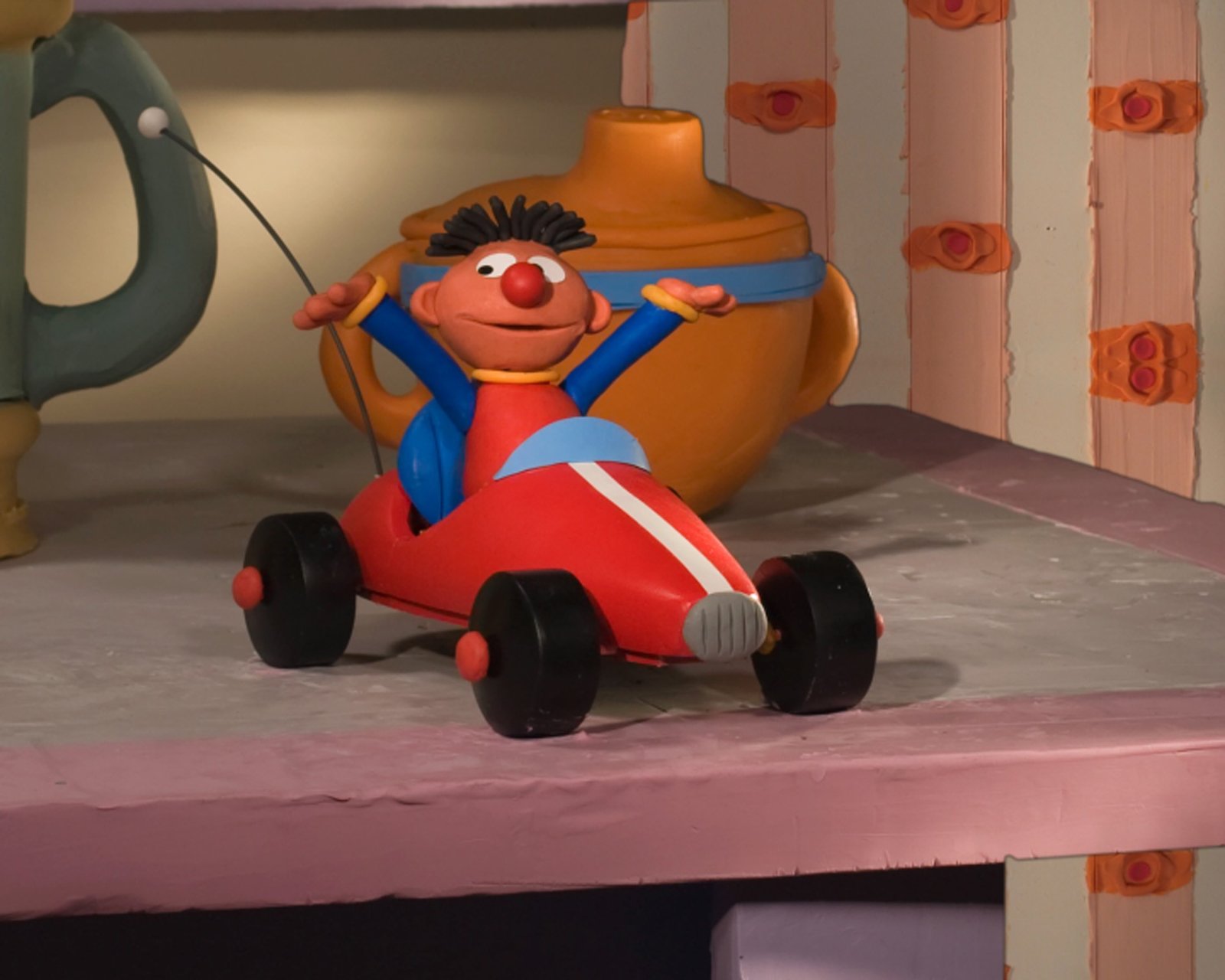 Ernie und Bert als WinzlingeBert gerät unverhofft in Schwierigkeiten, als er mit dem Spielzeugauto über den Tisch rast.Bild: © NDR/Sesameworkshop