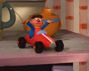 Ernie und Bert als WinzlingeErnie hat großen Spaß im ferngesteuerten Spielzeugauto, mit dem er über den Tisch rasen kann.Bild: © NDR/Sesameworkshop