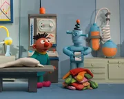 Ernie und Bert als ErfinderErnie wundert sich über den Roboter, der sogar Socken stricken kann.Bild: © NDR/Sesameworkshop