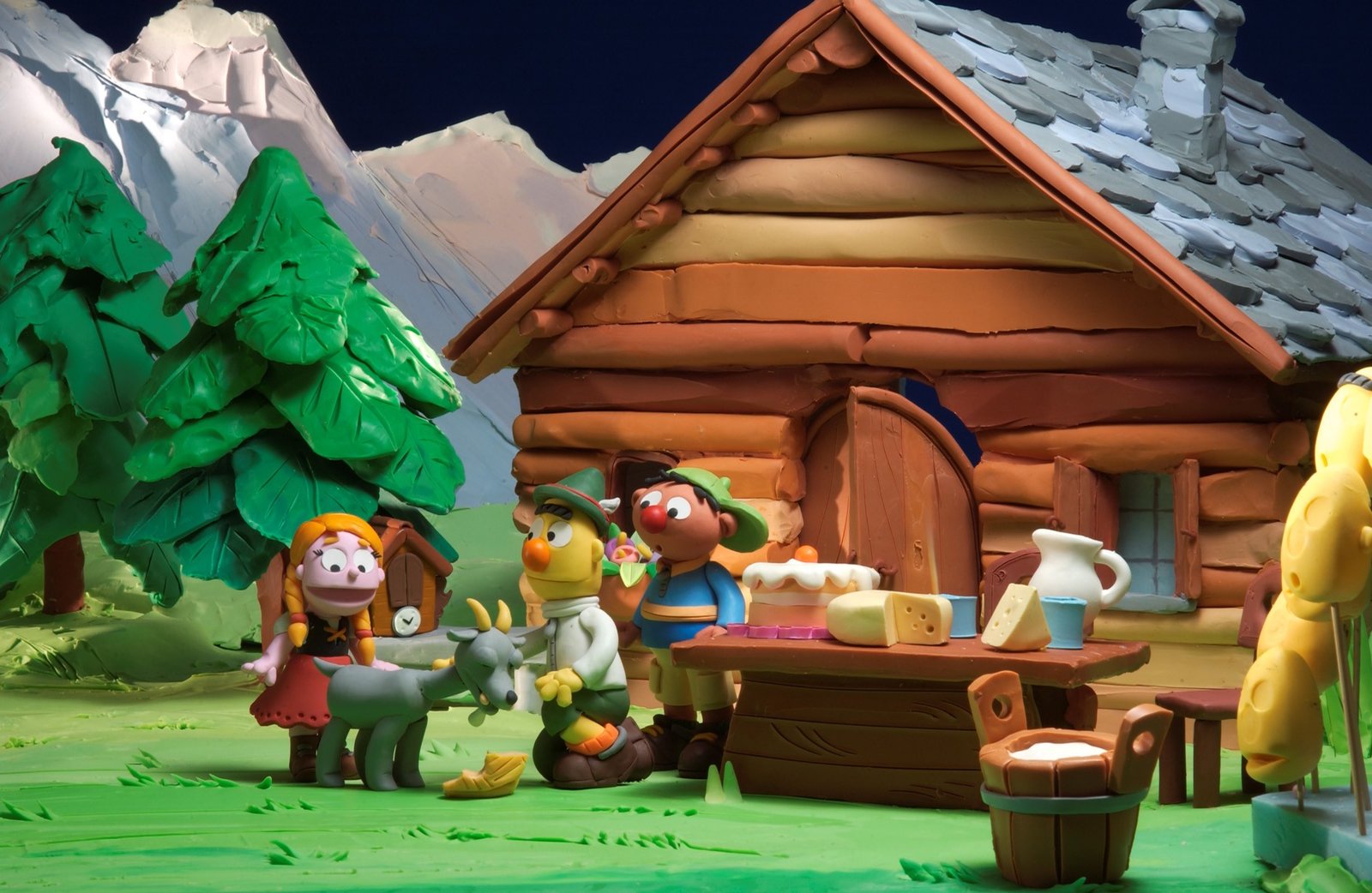 Ernie und Bert in den BergenErnie (re.) und Bert (Mi.) treffen in den Bergen die berühmte Heidi (li.) mit ihrer Ziege und werden in ihre Hütte eingeladen.Bild: © NDR/Sesameworkshop