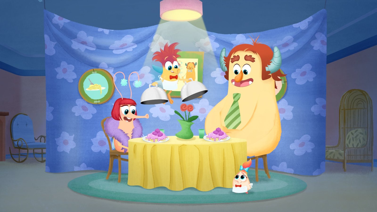 Glibberghetti mit SchlabbersoßeHerr und Frau Ooga sind beeindruckt vom Service ihrer Kinder.Bild: © KiKA/Nelvana