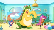 Teilen oder nicht teilenDer Tilliesaurus zeigt mit dem Roysaurus und dem Esmesaurus wie Dinos stampfen.Bild: © KiKA/Nelvana