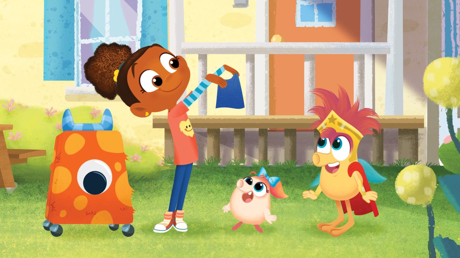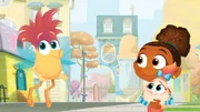 Kinderwagen-RallyeEsme und Fee verabschieden Hugo zur Schule.Bild: © KiKA/Nelvana