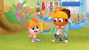 Sing schon, Roy!Esme traut ihren Ohren nicht, dass Lottie den Monstersittern helfen will.Bild: © KiKA/Nelvana