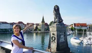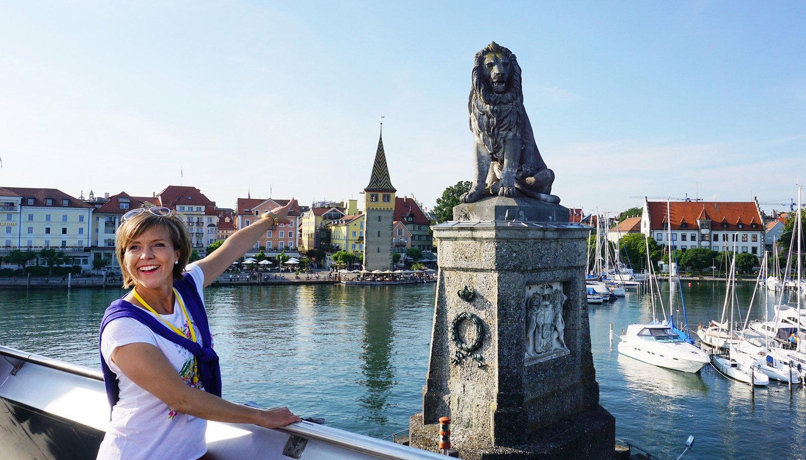Unterwegs in der Bregenzer BuchtAnnette Krause und der bayerische Löwe im Hafen Lindau.Bild: © SWR/Jochen Schmid