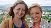 Rund um StuttgartAnna Lena Dörr (re.) zusammen mit der ehemaligen Weinkönigin Stefanie Schwarz. Mit ihr unternimmt sie eine Rundfahrt im Touristenbus "Stuggi" und erfährt dabei, dass Stuttgart Deutschlands Großstadt mit den meisten Rebflächen ist.Bild: © SWR/Jochen Schmid