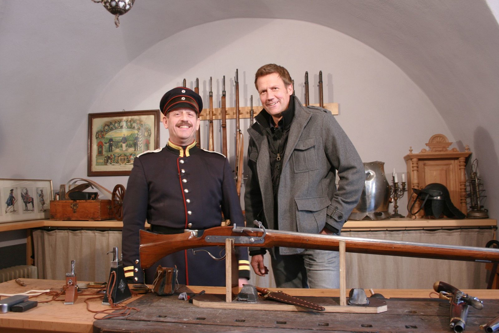 Unterwegs in KoblenzJens Hübschen mit Jörg Höfer (Büchsenmacher) in der Büchsenmacherwerkstatt auf der Festung Ehrenbreitstein.Bild: © SWR/Daniel Dorn