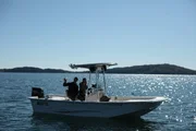 Die versunkenen GräberHosts Jessica and Phil on a boat on Lake Lanier.Bild: © Discovery Communications, LLC