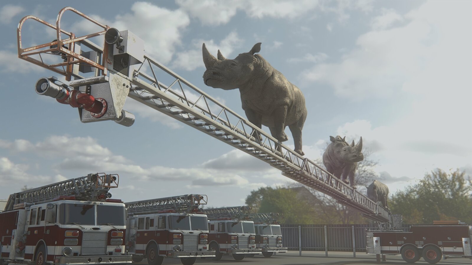 FeuerwehrautosCGI image - Two rhinos standing on aerial ladder.Bild: © Copyright © The National Geographic Channel.