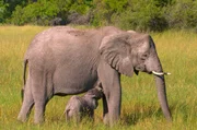 Tiere im Okavango-DeltaEine Elefantenkuh säugt ihr Jungtier. Die jungen Elefantenkälber trinken bis zu elf Liter Milch pro Tag. Nach drei Monaten beginnen sie, zusätzlich Gräser zu fressen und Wasser zu trinken.Bild: © arte