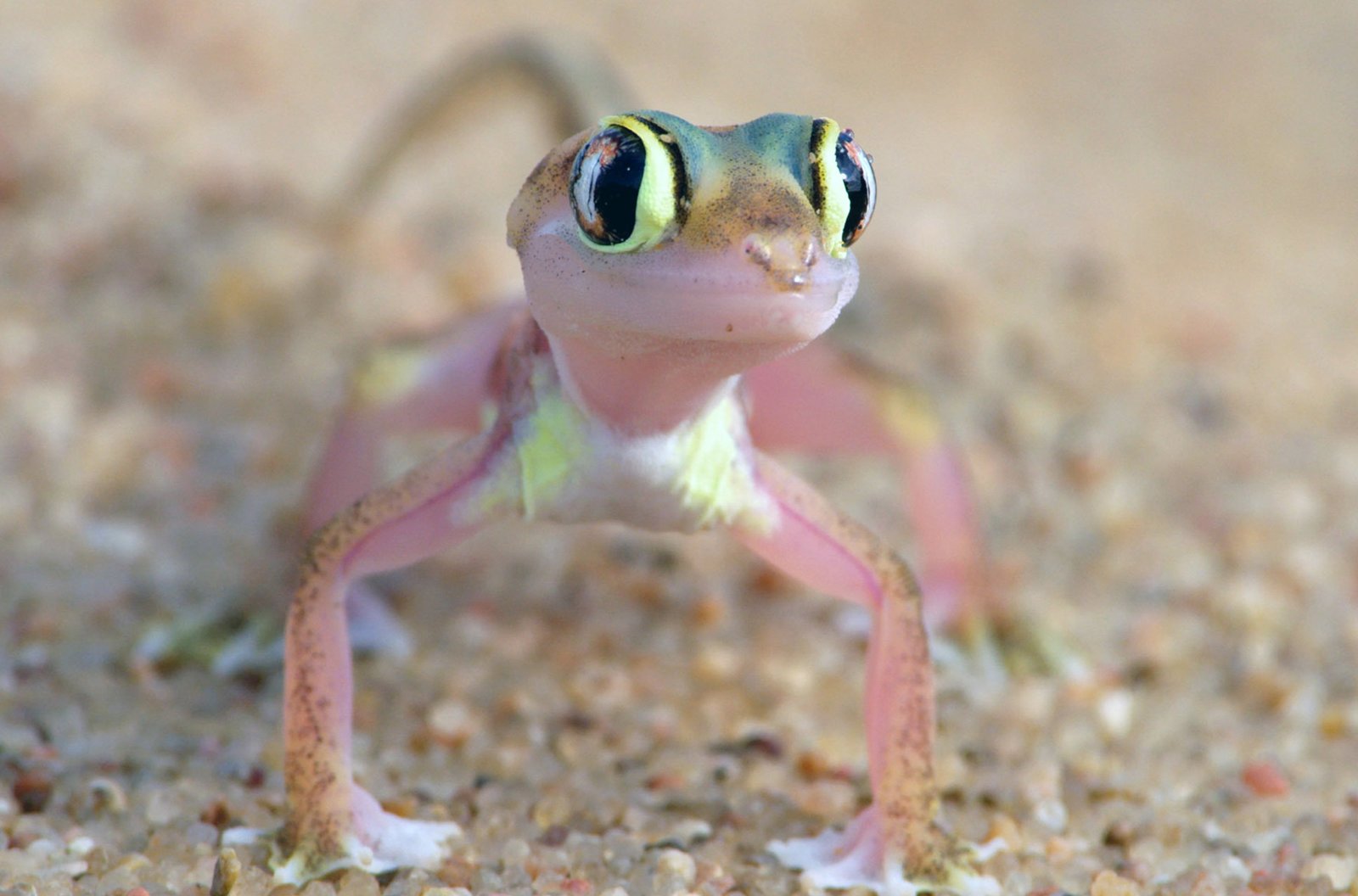 Tiere in der Namib-WüsteUm sich vor der Sonne zu schützen, vergraben sich die Wüstengeckos tagsüber im Sand. Zum schnellen Buddeln besitzen sie zwischen ihren Zehen schwimmhautähnliche Strukturen.Bild: © 3sat