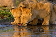 Tiere im Okavango-DeltaZwei Löwenjunge trinken gemeinsam Wasser.Bild: © ZDF und Lion Mountain Media 2019.