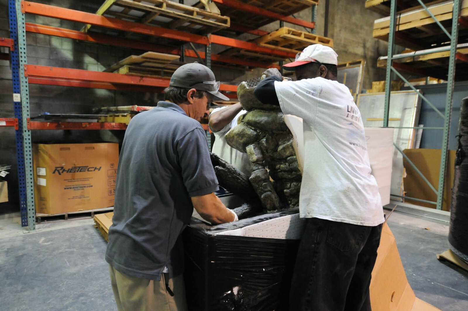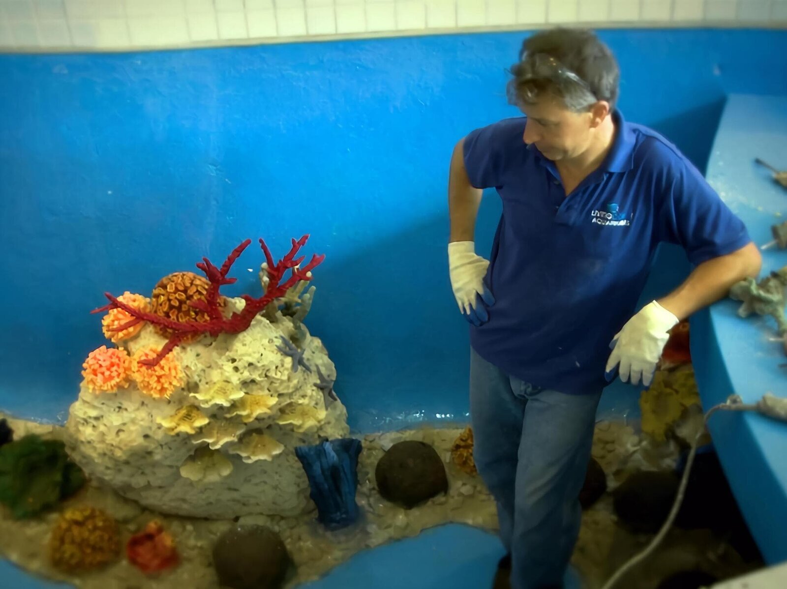 Die HerausforderungJose and Living Color worker lifting rock structure into tank.Bild: © NGC / Lindsey Snell