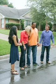 Ein Haus mit SchuhschrankDie Renovierungsprofis Chip (r.) und Joanna Gaines (l.) verwandeln dieses Mal ein renovierungsbedürftiges "Aunt Opal House" in ein traumhaftes neues Zuhause für eine fünfköpfige Familie in Woodway. Als die McKenzies (2.v.l.,2.v.r.) anfangs das unrenovierte Haus sehen, sind sie jedoch noch skeptisch ...Bild: © 2015, HGTV/ Scripps Networks, LLC. All Rights Reserved. Lizenzbild frei