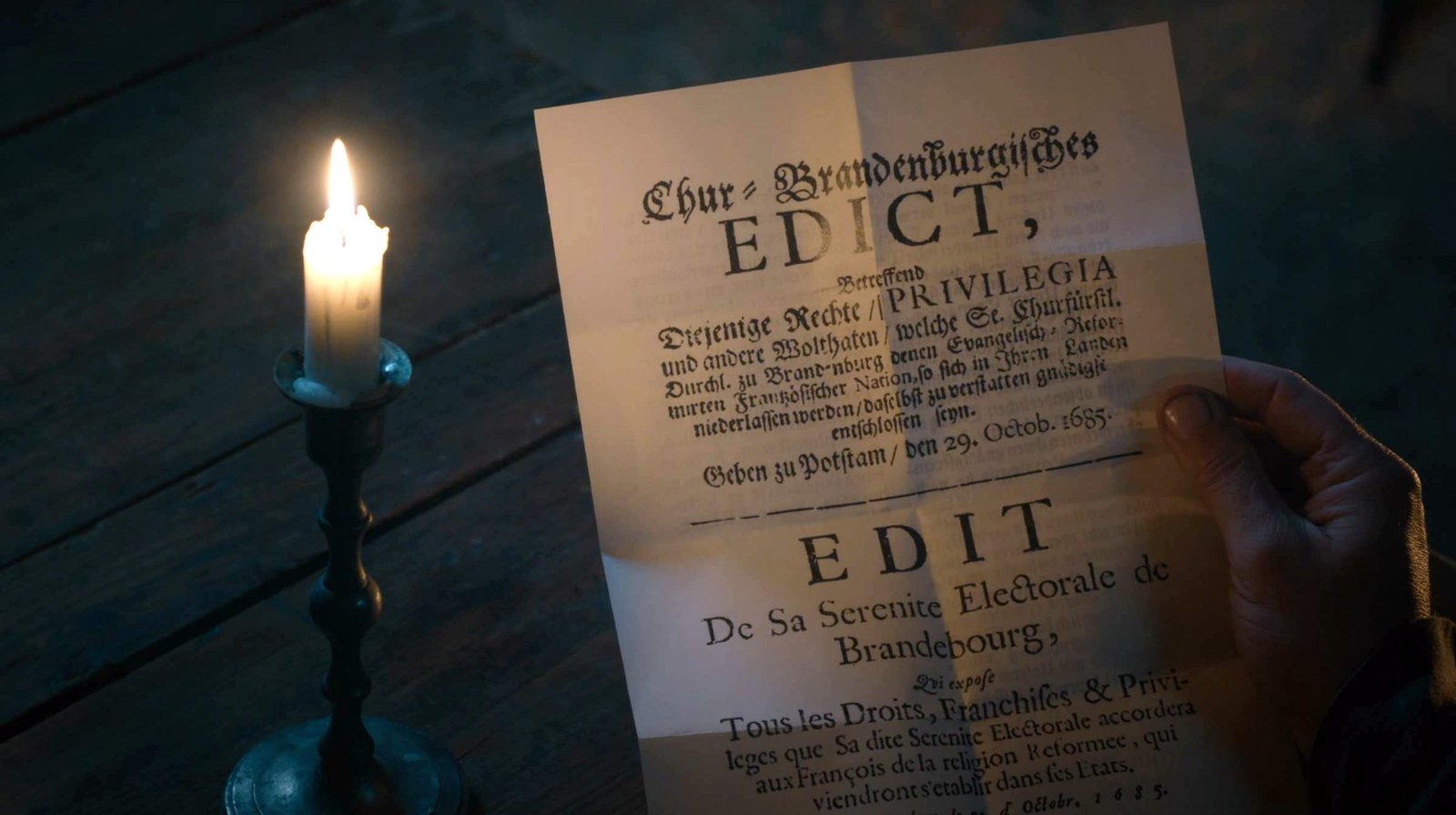 Aufbruch ins UngewisseAufgrund ihres protestantischen Glaubens werden sie geächtet und ermordet. Mit einem Federstrich löst der französische König Ludwig XIV. 1685 die Verfolgung der Hugenotten aus. Als sie keinen Ausweg mehr sehen, fliehen sie in die protestantischen Gebiete Europas: In deutsche Fürstentümer, aber auch nach England, in die Niederlande oder weiter nach Amerika. - Das Edict von Brandenburg.Bild: © rbb/Gebrueder Beetz Filmproduktion