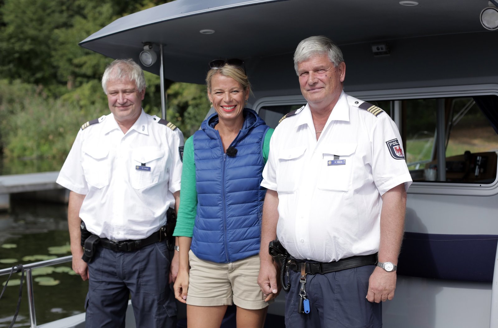 Ulrike Finck paddelt vom Müggelsee zum Kriensee„Flussauf, flussab“ paddelt Ulrike Finck mit dem Kajak vom größten Berliner See bis zum kleinen Kriensee im Brandenburgischen. Unterwegs begegnet sie sportlichen Paddlern, entspannten Sonnenbadern, PS verrückten Speedbootfans und einem Team der Wasserschutzpolizei. - Ulrike Finck mit Beamten der Wasserschutzpolizei ErknerBild: © rbb/Felix Luebbert