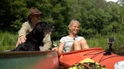 Ulrike Finck paddelt vom Müggelsee zum Kriensee„Flussauf, flussab“ paddelt Ulrike Finck mit dem Kajak vom größten Berliner See bis zum kleinen Kriensee im Brandenburgischen. Unterwegs begegnet sie sportlichen Paddlern, entspannten Sonnenbadern, PS verrückten Speedbootfans und einem Team der Wasserschutzpolizei. - Ulrike Finck (re.) mit Rettungshund Ado und Hundeführerin PetraBild: © rbb/Felix Luebbert