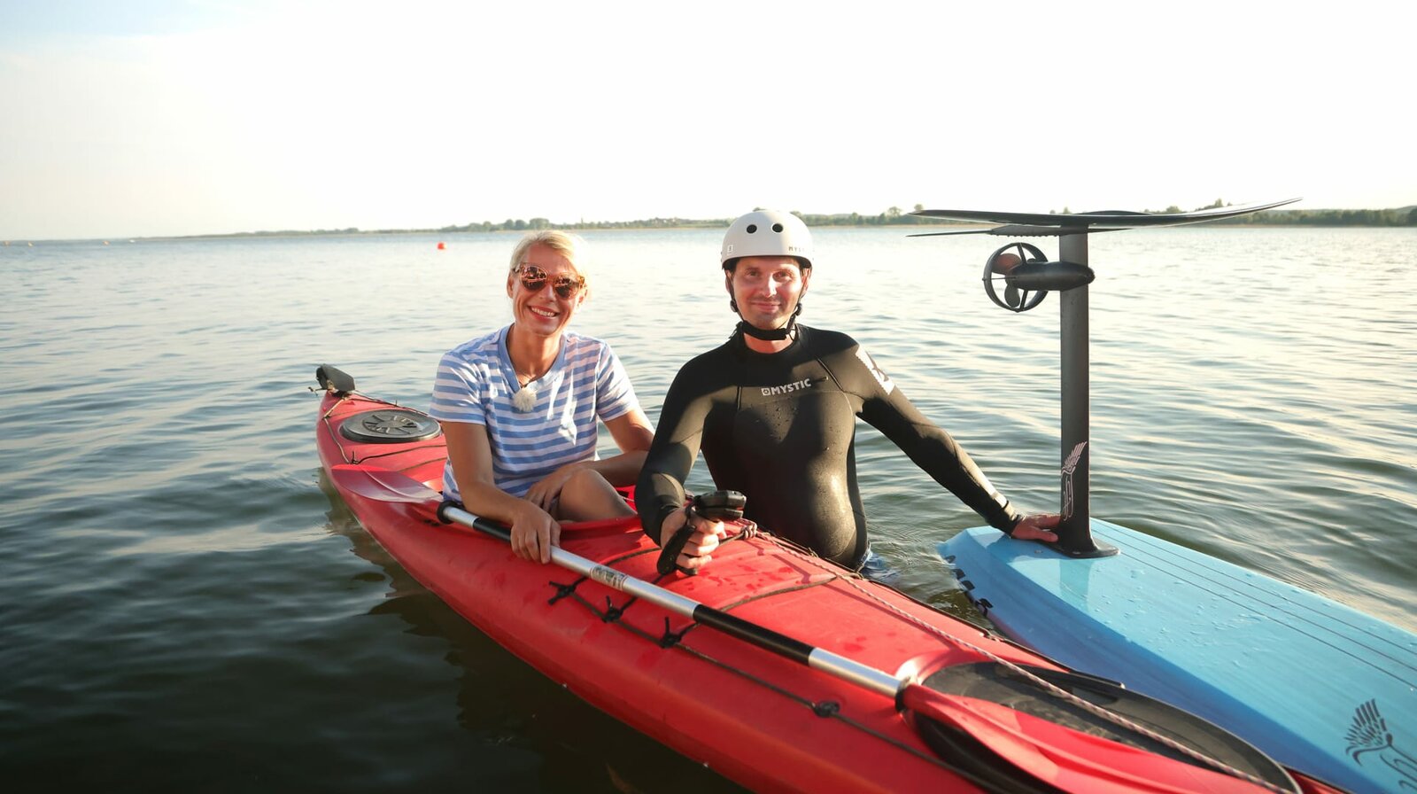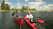 Ulrike Finck paddelt von der Uckermark zum Stettiner HaffVom Templiner Stadtsee aus paddelt Ulrike Finck diesmal wieder mit ihrem Kajak durch die beeindruckenden Landschaften der Uckermark. Seerosenteppiche, Schilfreviere und einsame Seen liegen dabei auf ihrem Weg bis zum Stettiner Haff. - Ulrike Finck mit eFoile-Anhänger Michael Kranz aus Prenzlau.Bild: © WDR/rbb/Björn Lindenblatt