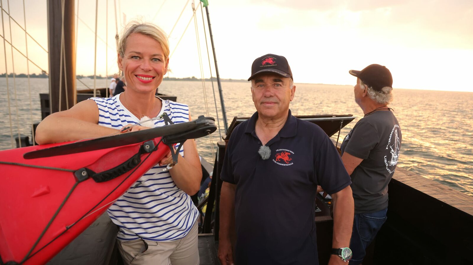 Ulrike Finck paddelt von der Uckermark zum Stettiner HaffVom Templiner Stadtsee aus paddelt Ulrike Finck diesmal wieder mit ihrem Kajak durch die beeindruckenden Landschaften der Uckermark. Seerosenteppiche, Schilfreviere und einsame Seen liegen dabei auf ihrem Weg bis zum Stettiner Haff. - Ulrike Finck trifft auf der Pommernkogge Vereinsvorsitzenden Lothar Hoffmann.Bild: © WDR/rbb/Björn Lindenblatt