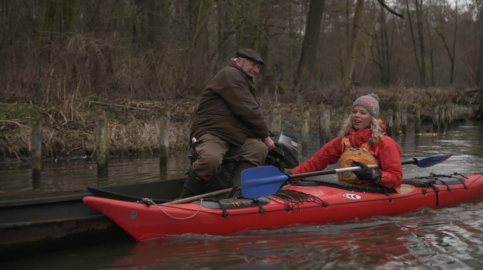 Ulrike Finck paddelt durch den winterlichen SpreewaldDie kalte Jahreszeit im Spreewald gilt unter Wassersportlern als Geheimtipp. Abseits vom Trubel der Sommermonate lassen sich Natur und Landschaft besonders gut vom Boot aus erleben. Dick eingepackt und mit viel Respekt vor den tiefen Temperaturen paddelt Ulrike Finck von Lehde über Leipe und Burg bis nach Cottbus und zurück. - Ulrike Finck mit Herbert KonzackBild: © WDR/rbb