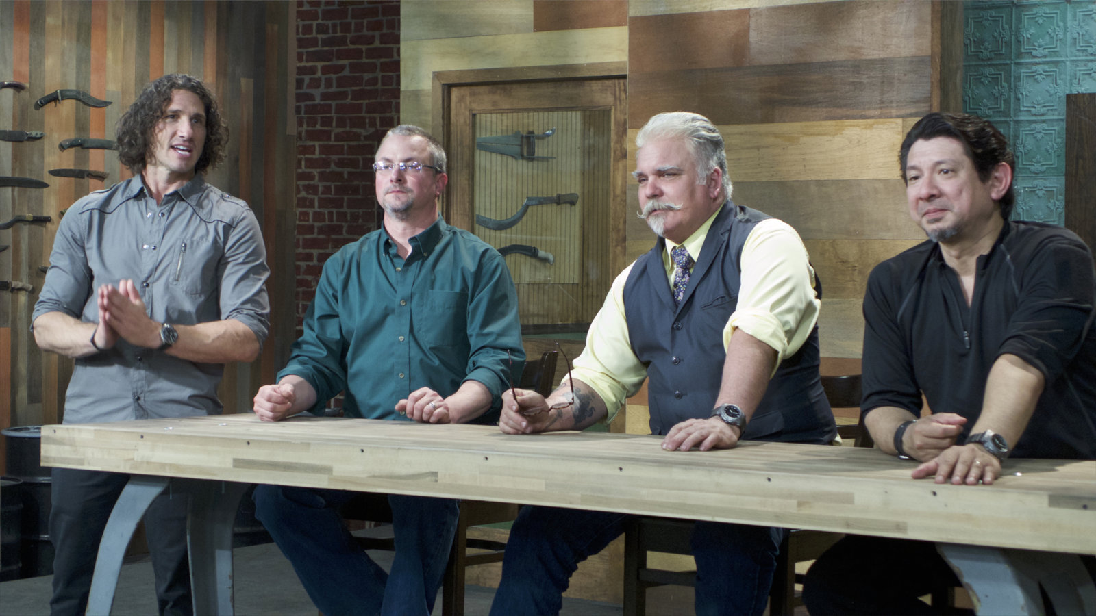 Sommerspiele - Teil 1Suchen bei "Forged in Fire" den besten Waffenschmied: die Experten David Becker (l.), J. Neilson (2.v.l.), Doug Marcaida (r.) sowie Moderator und US-Army-Veteran Wil Willis (2.v.r.) ...Bild: © The History Channel