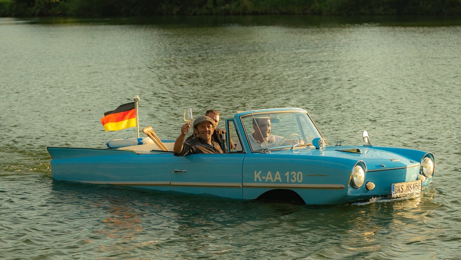 Schmidt Max (links) unterwegs mit dem Amphicar, einem schwimmfähigen Oldtimer-Auto, das auf der Straße, aber auch im Wasser, also in der Mosel, fahren kann.Bild: © BR