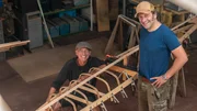 Thomas Grögler (links) hat seine Werkstatt in einem denkmalgeschützten Güterkahn eingerichtet. Dorthin lädt er den Schmidt Max ein, um mit ihm ein Paddelboot zu bauen. Mit traditionellen Biege- und Bindetechniken schreinert sich der Moderator der "freizeit" ein Grönlandkajak praktisch auf den Leib.Bild: © BR/André Goerschel