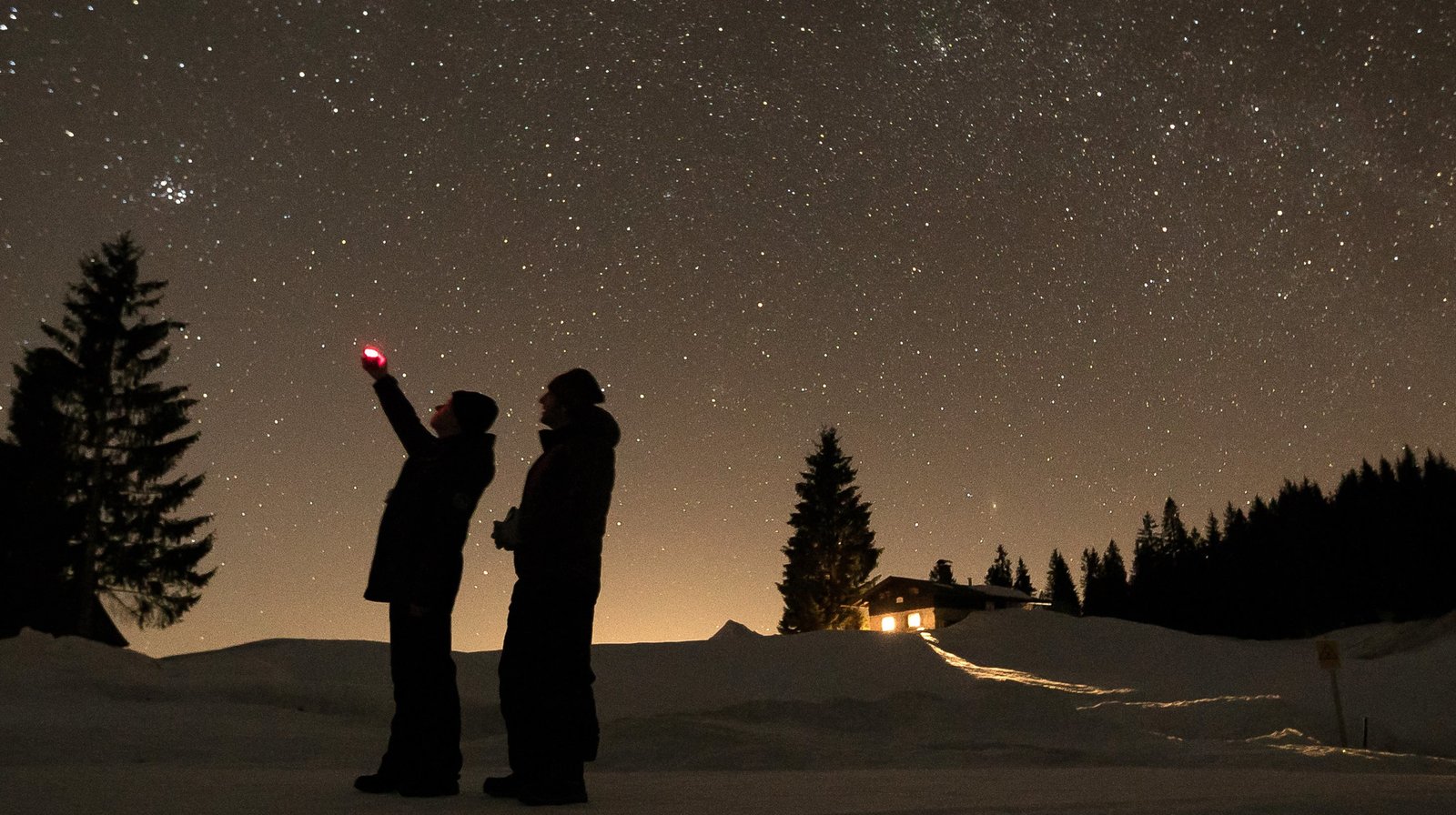 Manuel Philipp (links) ist der Nachtschutzbeauftragte im 1. Sternenpark in den Alpen. Mit einem sky quality meter misst er die Dunkelheit. Und die ist auf der Winklmoosalm besonders dunkel. Der Schmidt Max (rechts) hat eine öffentliche Führung mitgemacht.Bild: © BR/André Goerschel