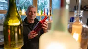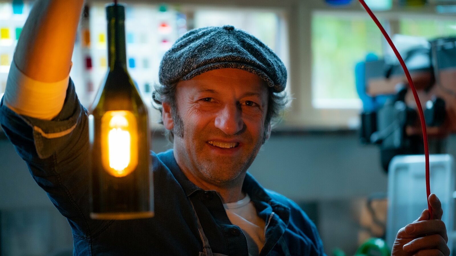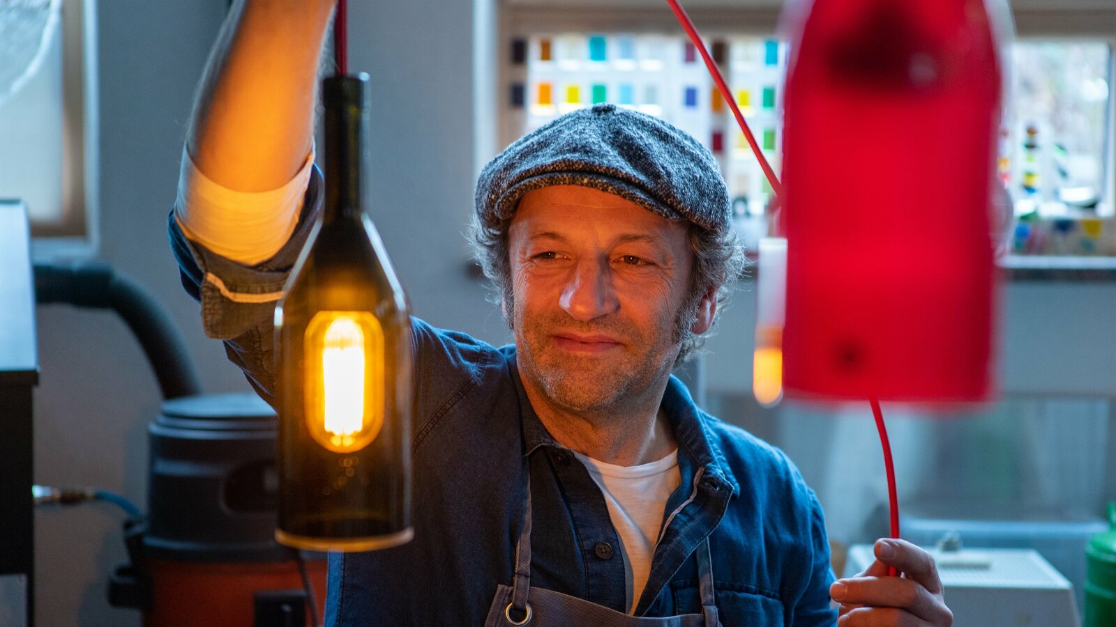 Glaskünstler Peter Witt mit seinen Flaschenlampen.Bild: © André Goerschel / BR / BR/André Goerschel