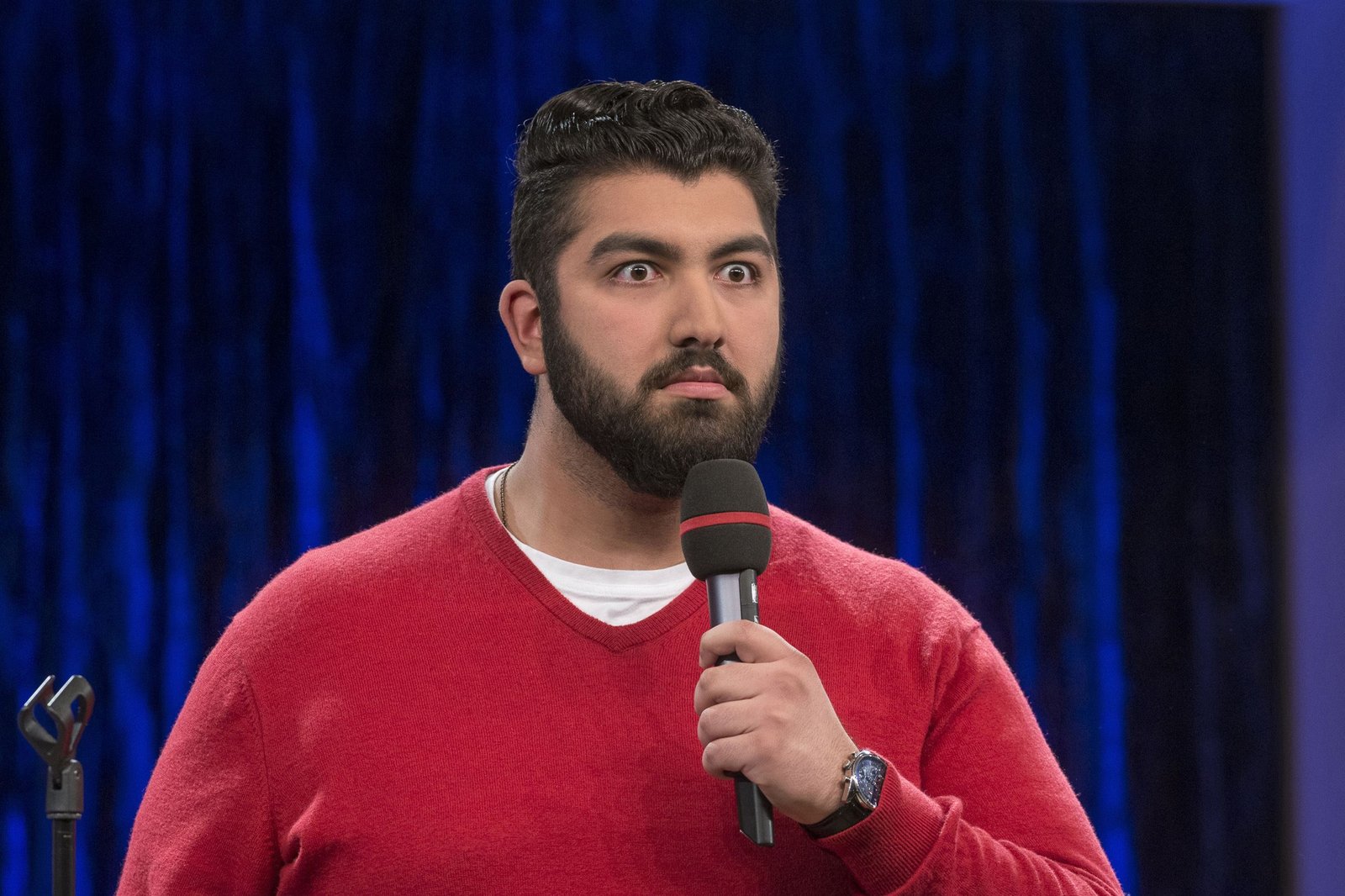 Faisal Kawusi auf der Bühne, seine scharfe Zunge scheut sich vor nichts.Bild: © SWR/Alexander Kluge