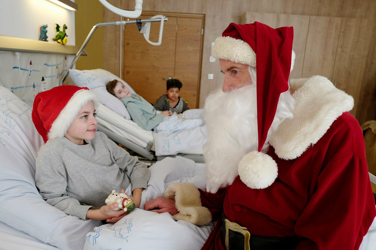 WeihnachtswunderPfarrer Sonnleitner (Johannes Herrschmann, r.) besucht den schwerkranken Tim (Louis Veronik, l.), der Weihnachten in der Klinik verbringen muss.Bild: © SRF/ZDF/Kerstin Stelter