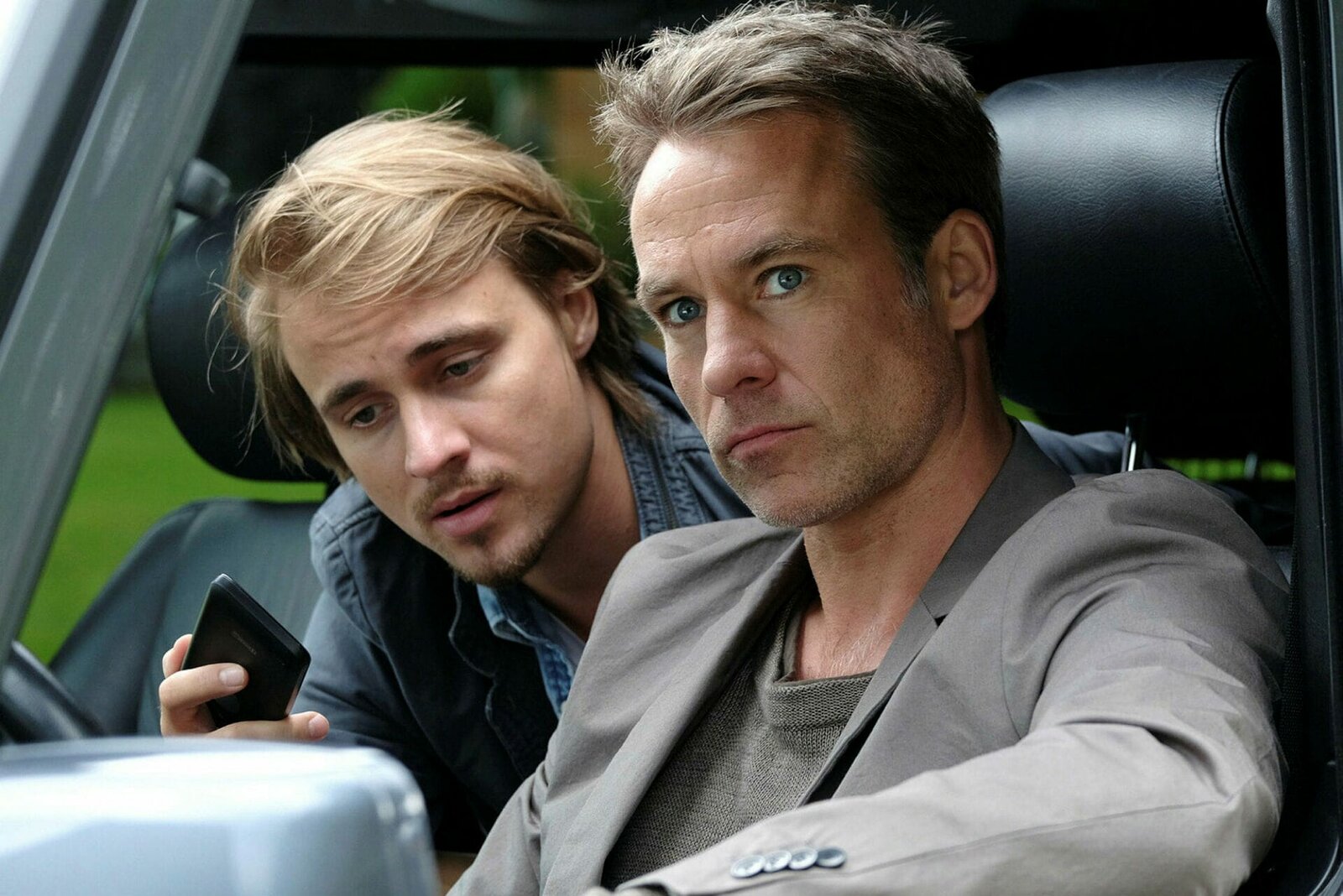 Endlich FrühlingSam (Constantin von Jascheroff, l.) versucht, Tierarzt Mark (Marco Girnth) mit Fotos auf seinem Handy davon zu überzeugen, dass manche Bauern in Frühling ihre Tiere alles andere als vorbildlich behandeln. Honorarfrei - nur für diese Sendung bei Nennung ZDF und Jacqueline Krause-BurbergBild: © SRF/ZDF/Jacqueline Krause-Burberg