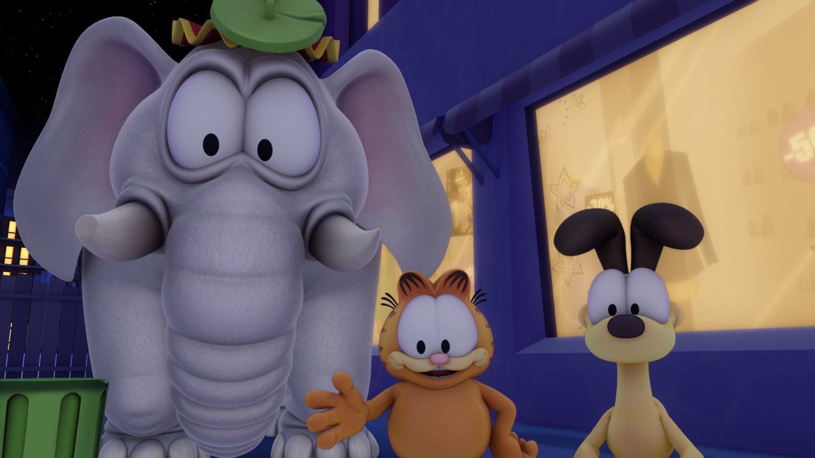 Ein Elefant in NotGarfield und Odie versuchen Shrimpy (li.) zu tarnen, da dieser bereits von der Polizei gesucht wird.Bild: © HR/DARGAUD MEDIA