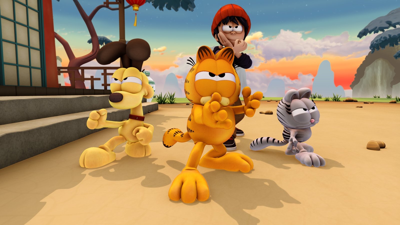 Das Geheimnis der goldenen Katze (1)Um den zweiten Teil des Schlüssels zu finden, müssen Nermal, Odie und Garfield Kung Fu lernen und eine Prüfung bestehen.Bild: © HR/DARGAUD MEDIA