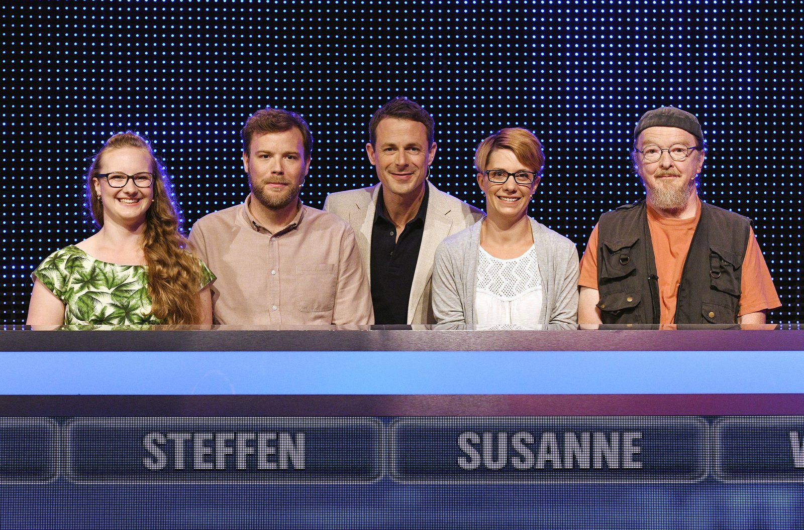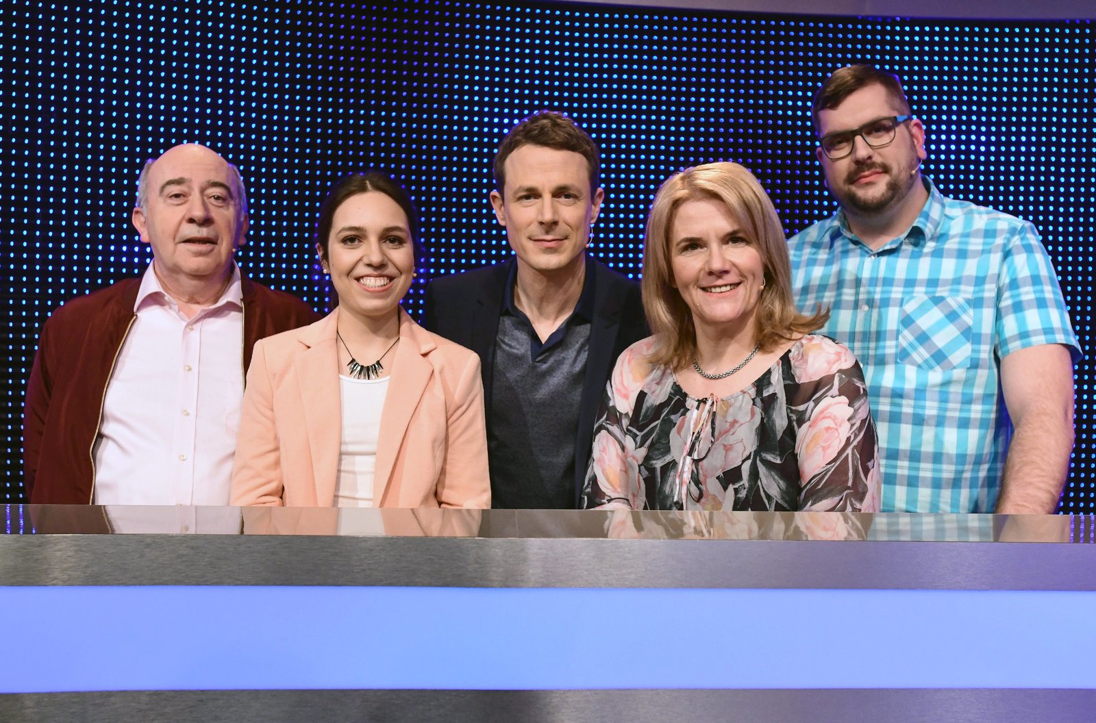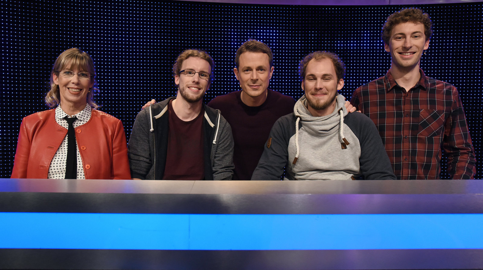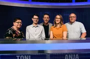 Folge 180Moderator Alexander Bommes (2.v.l.) mit den Kandidaten Laurens Roggenbuck (l.) Claire Möhle (3.v.r.), Merlin Koglin (2.v.r.) und Helga Wahlers (r.).Bild: © ARD/Uwe Ernst