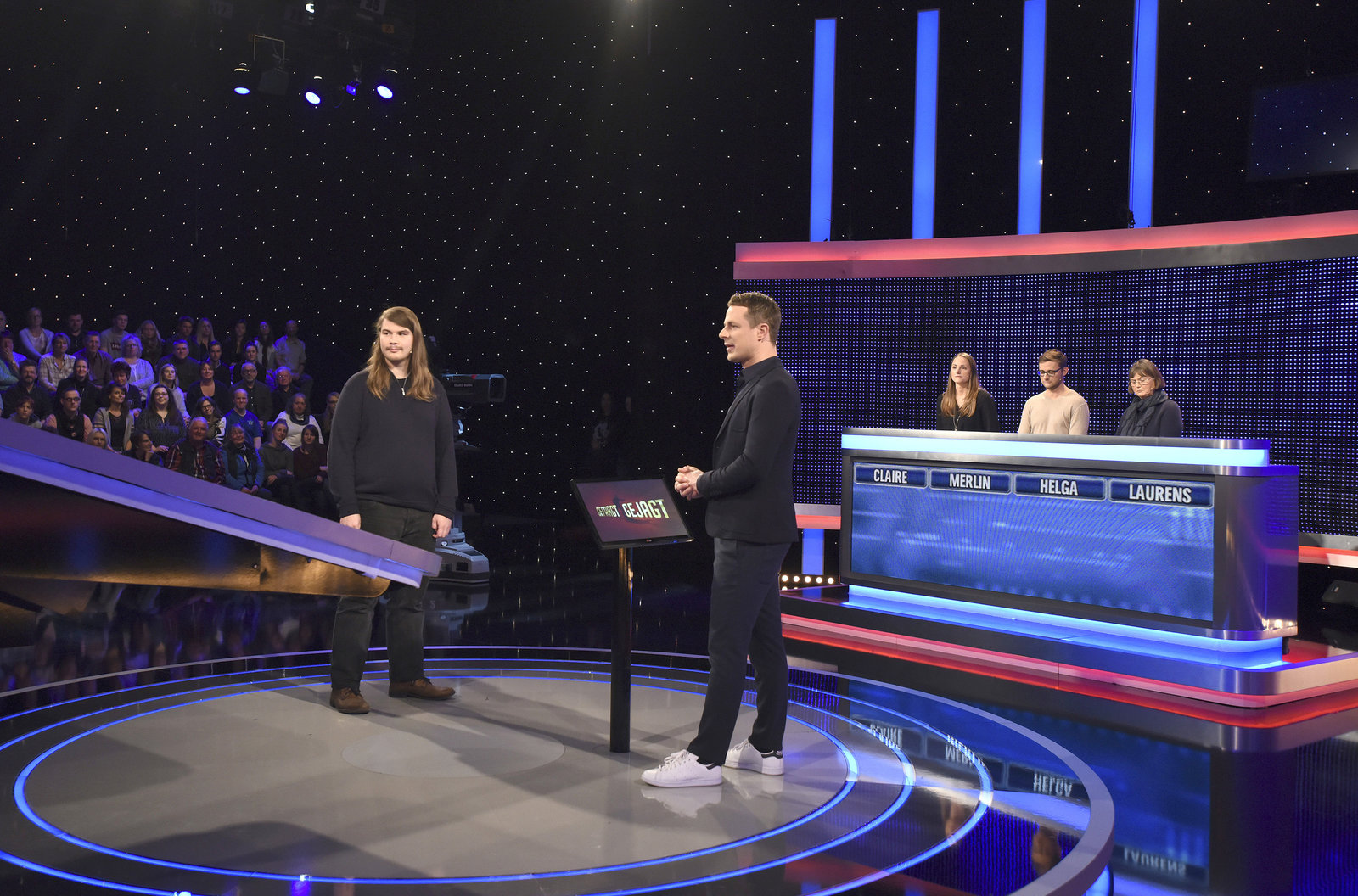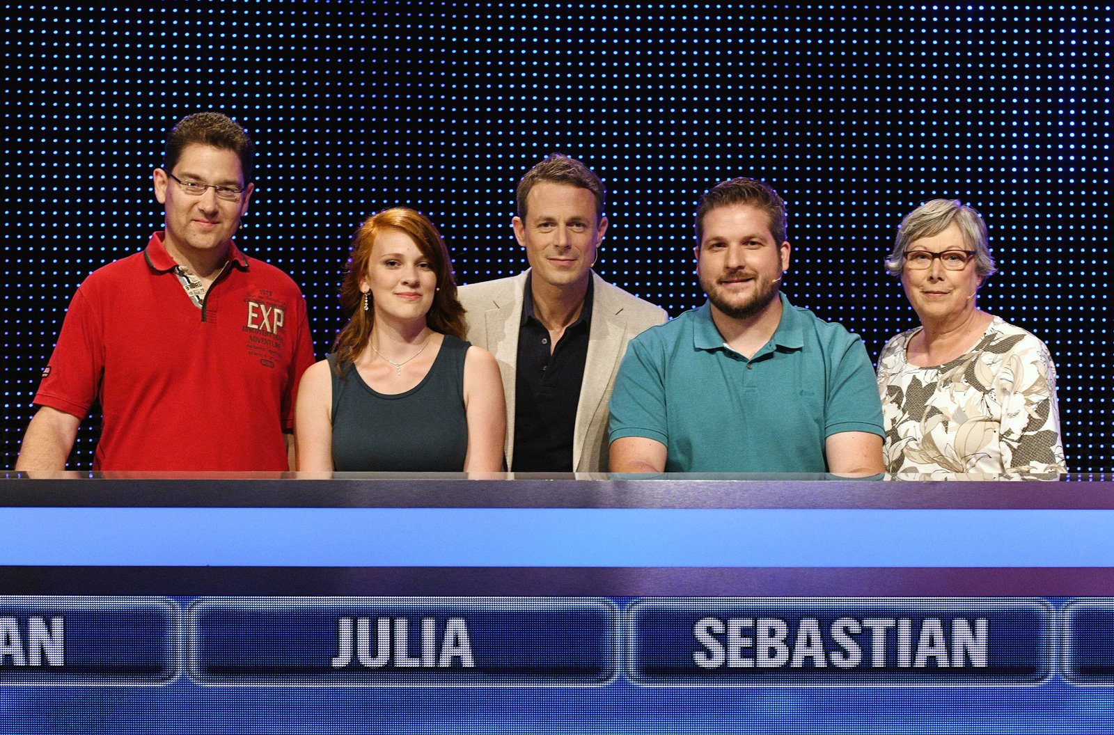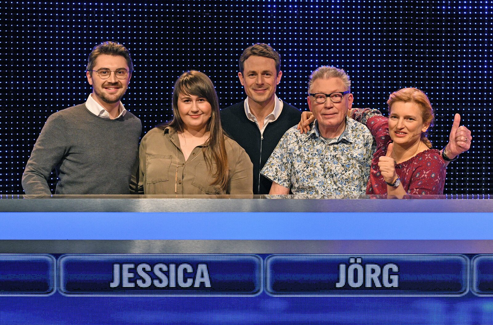 Folge 180Moderator Alexander Bommes (2.v.l.) mit den Kandidaten Laurens Roggenbuck (l.) Claire Möhle (3.v.r.), Merlin Koglin (2.v.r.) und Helga Wahlers (r.).Bild: © ARD/Uwe Ernst