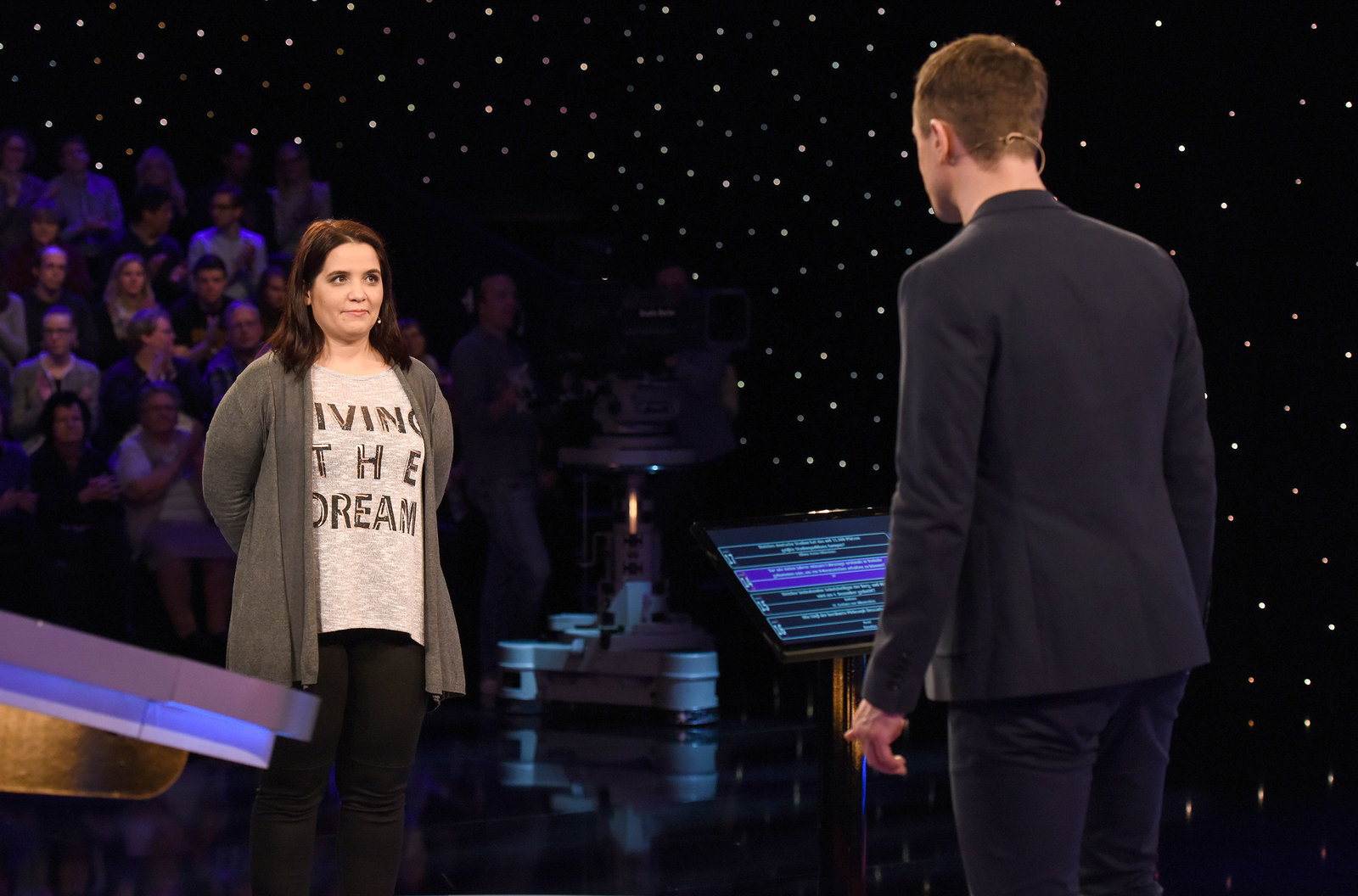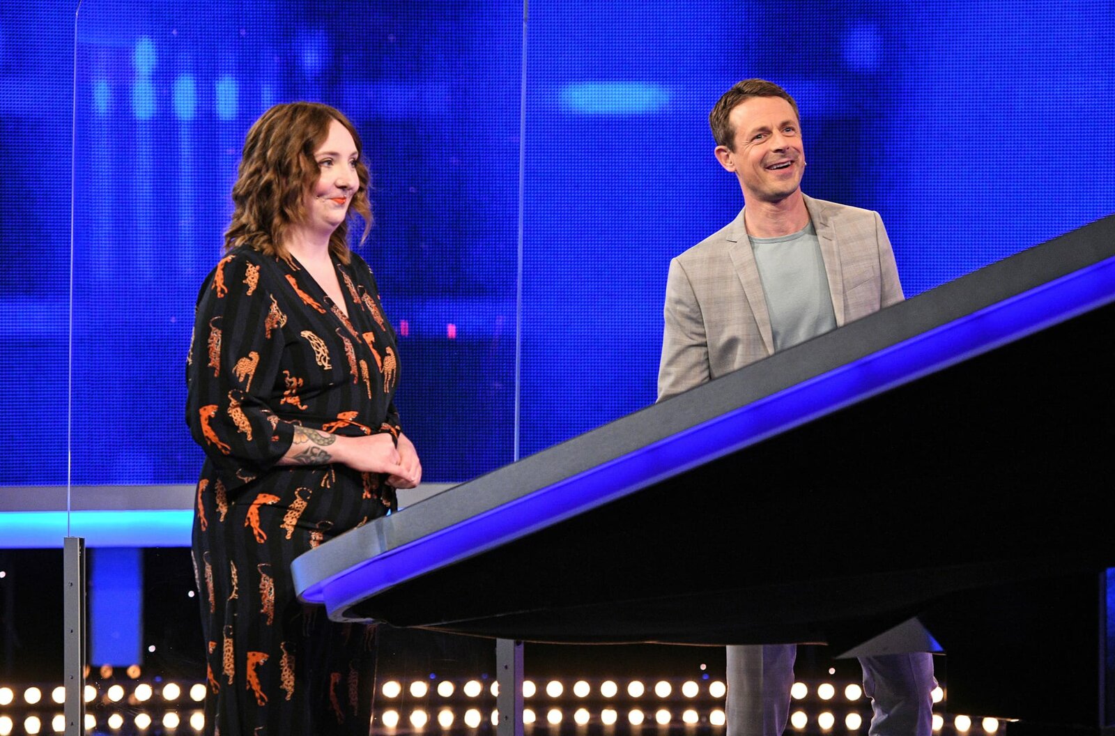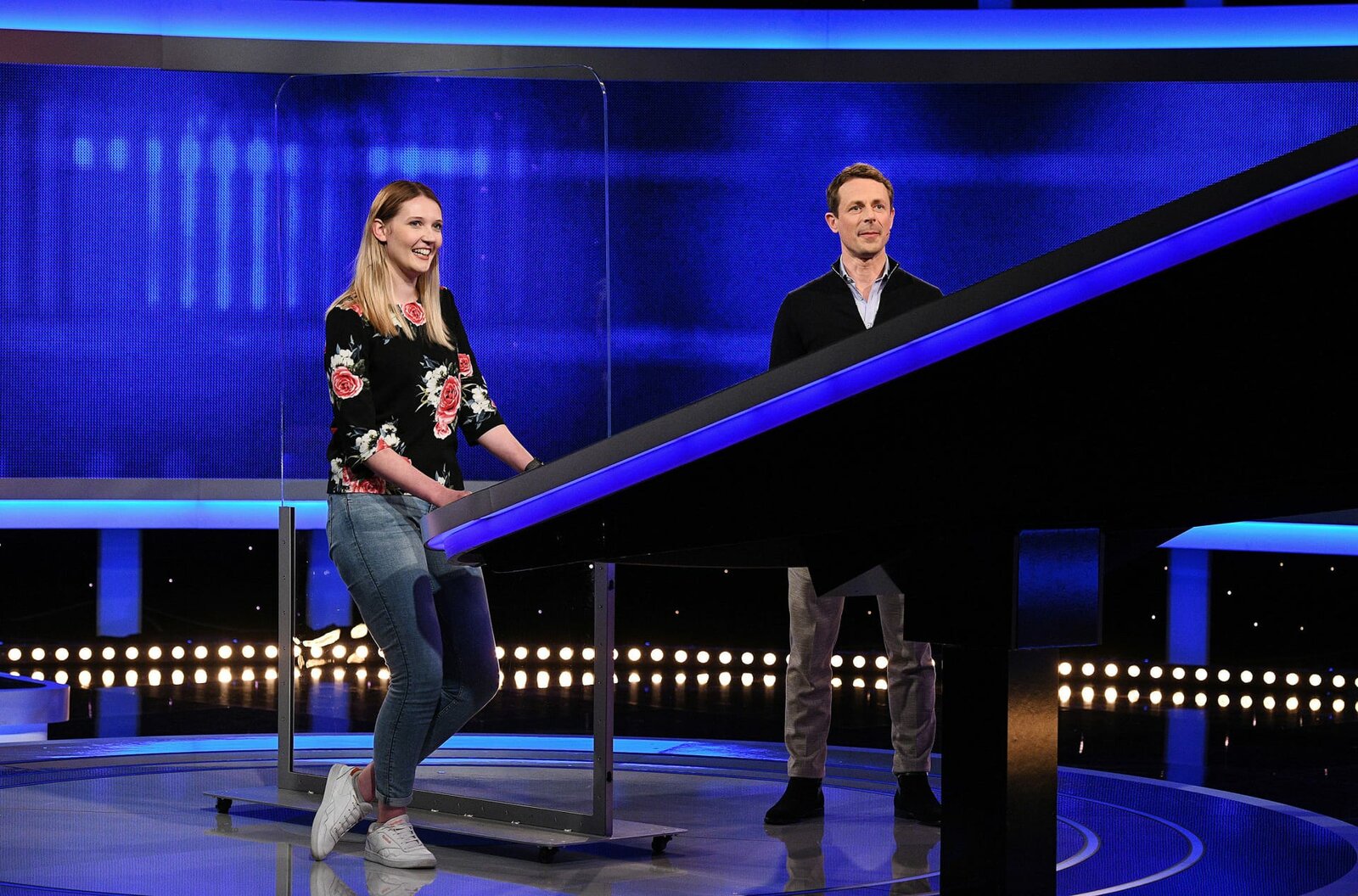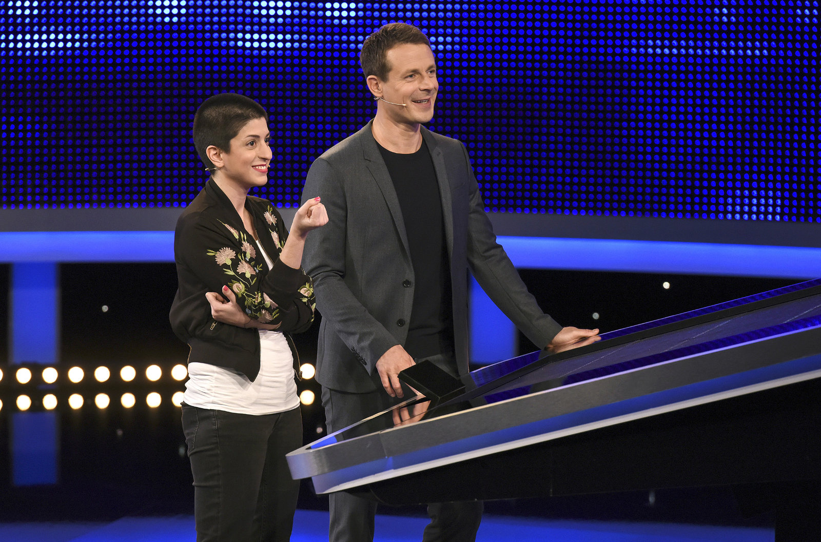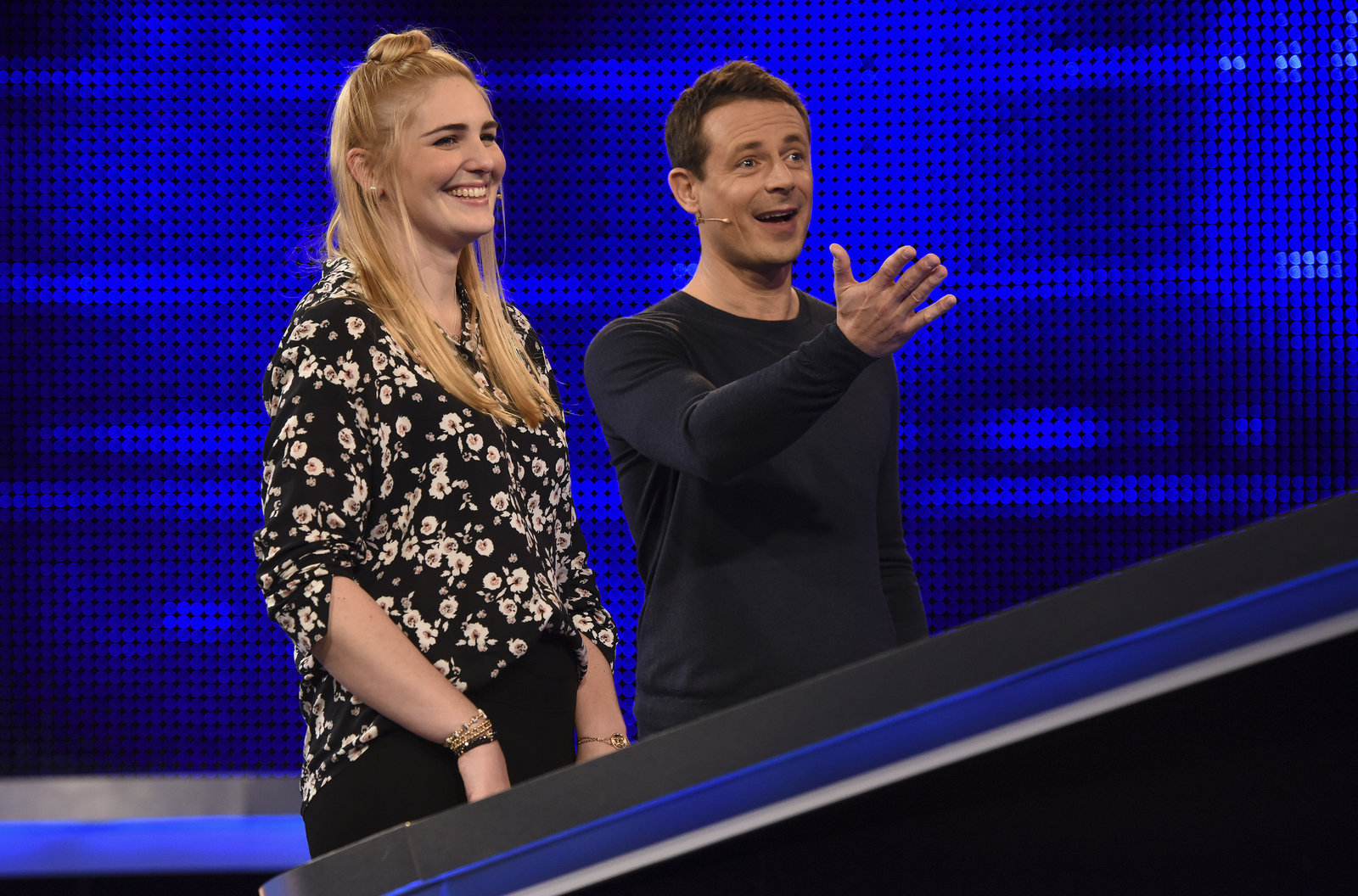 Moderator Alexander Bommes (r.) mit der Kandidatin Linda Wullenweber (l.).Bild: © ARD/Uwe Ernst