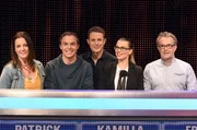 Familie vs. Jäger (4)Moderator Alexander Bommes (mitte) mit den Kandidaten (v.l.n.r. am Panel): Susanne Schäfer, Philipp Schäfer, Felix Schäfer, Frederic Schäfer.Bild: © NDR/Uwe Ernst