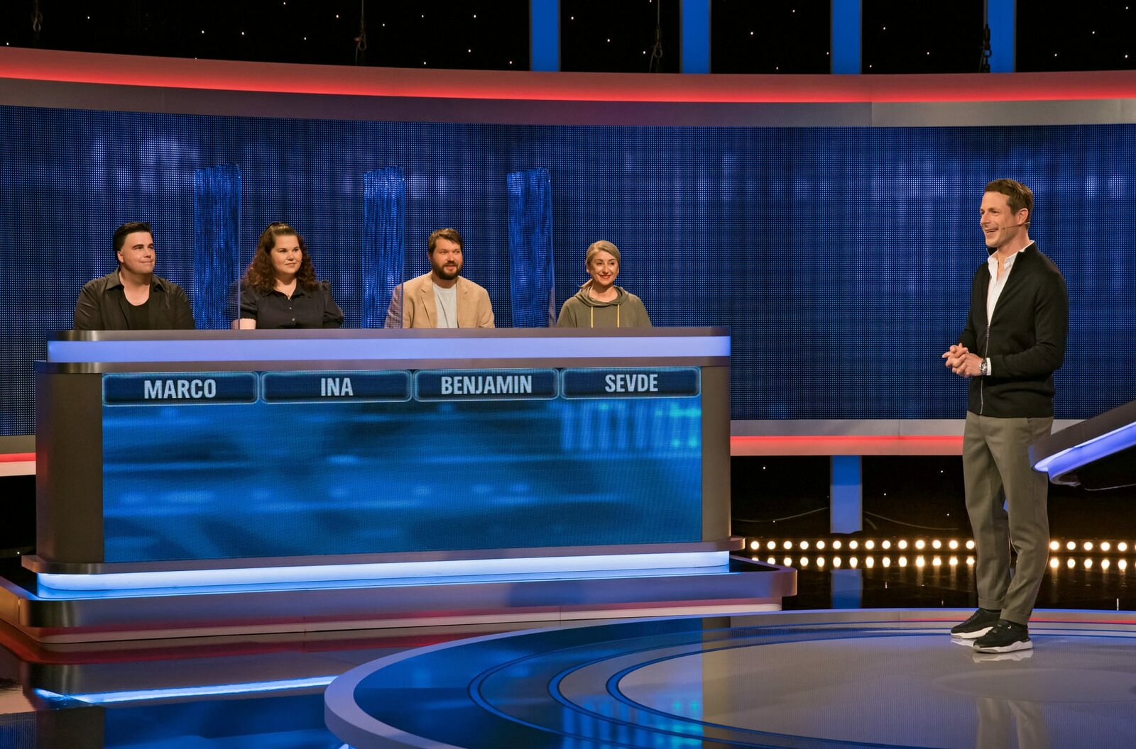 Moderator Alexander Bommes (r.) mit den Kandidaten (v.l.n.r.): Marco Otto, Sabrina Vaesen-Beudels, Benjamin Krense und Sevde Yilmaz.Bild: © ARD/Uwe Ernst