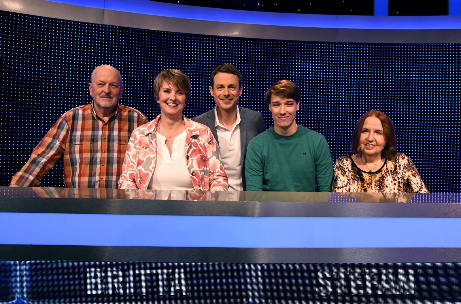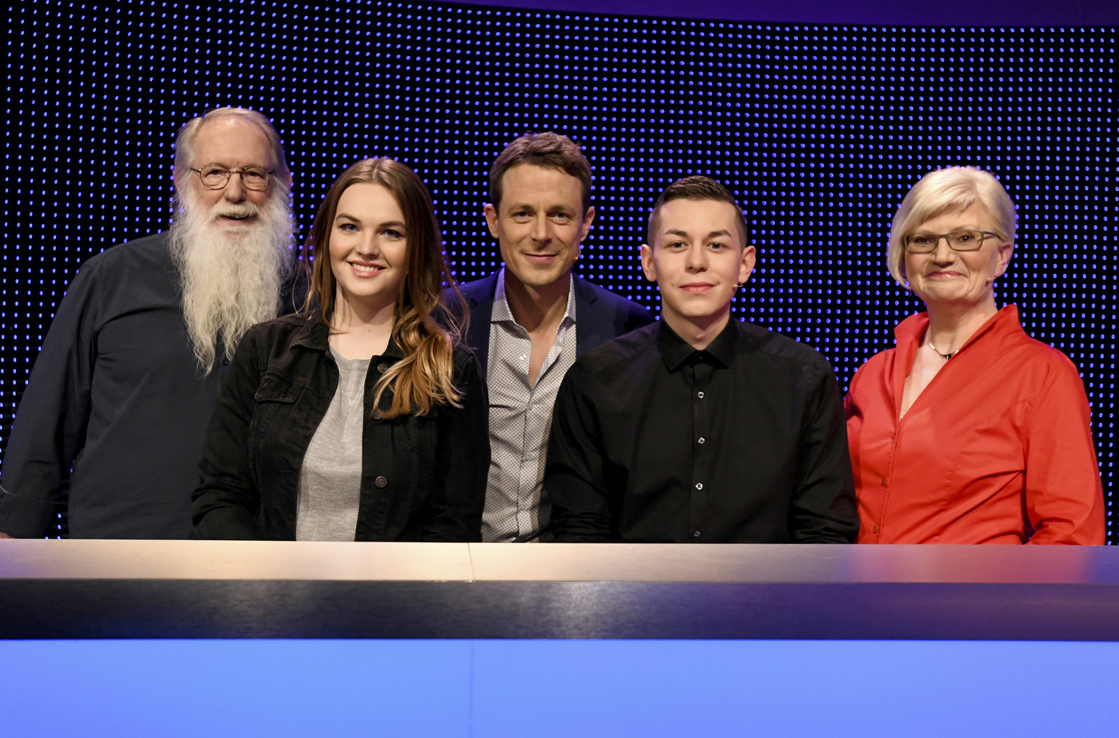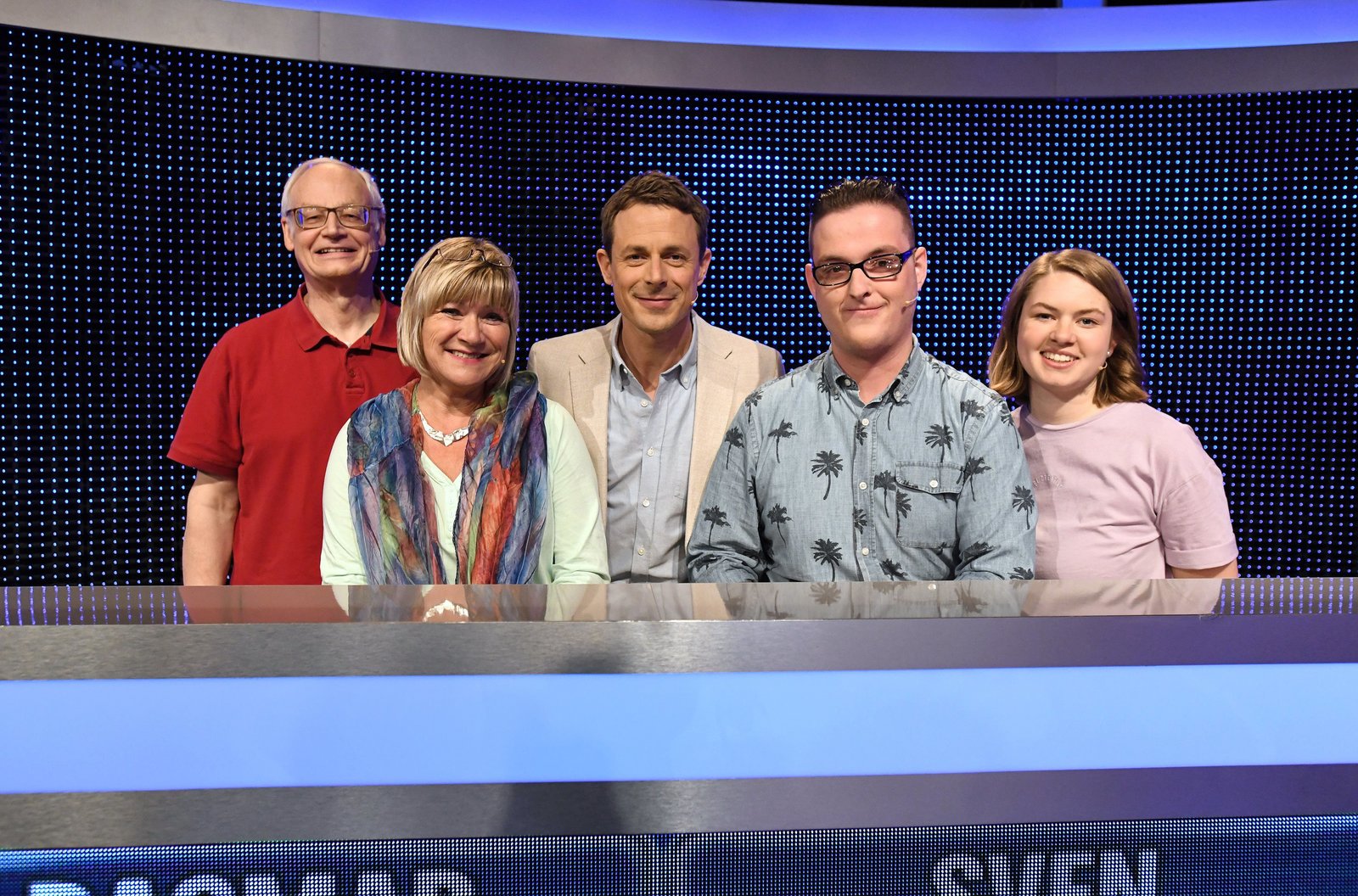 Folge 357Moderator Alexander Bommes (M.) mit den Kandidaten (v.l.n.r.): Sandra Falz, Helmuth Bohn, Wilma Wojtzik und Marwin Canpolat.Bild: © ARD/Uwe Ernst
